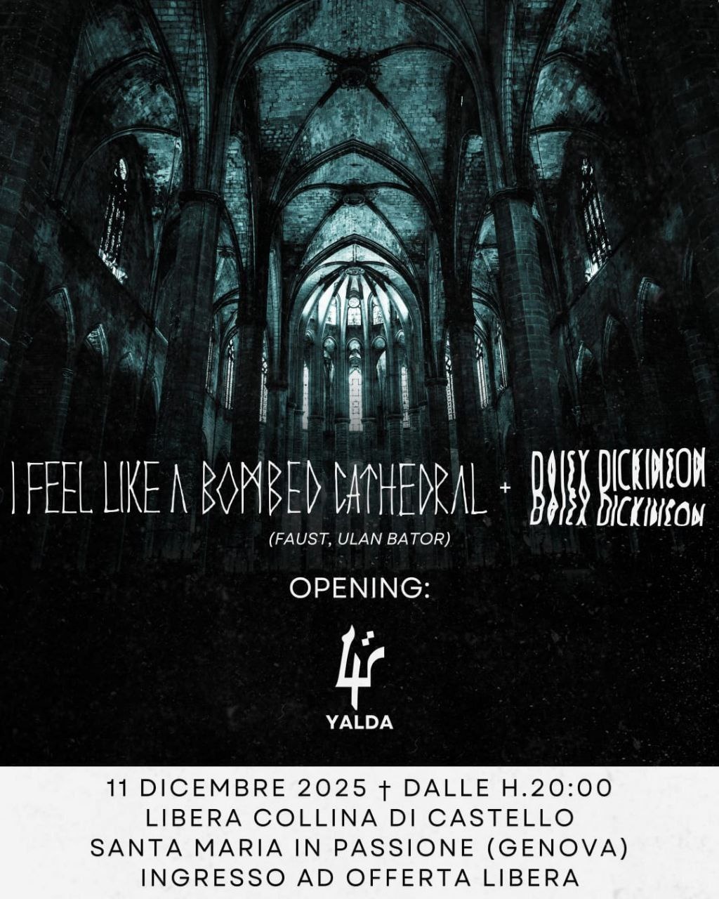 🌓 Imperdibile e ipnotica serata musicale giovedì prossimo, 11 dicembre, in collina, a partire dalle h 20. Apertura con il duo YALDA, a seguire I FEEL LIKE A BOMBED CATHEDRAL + DAISY DICKINSON (visual). Offerta libera! 🌓