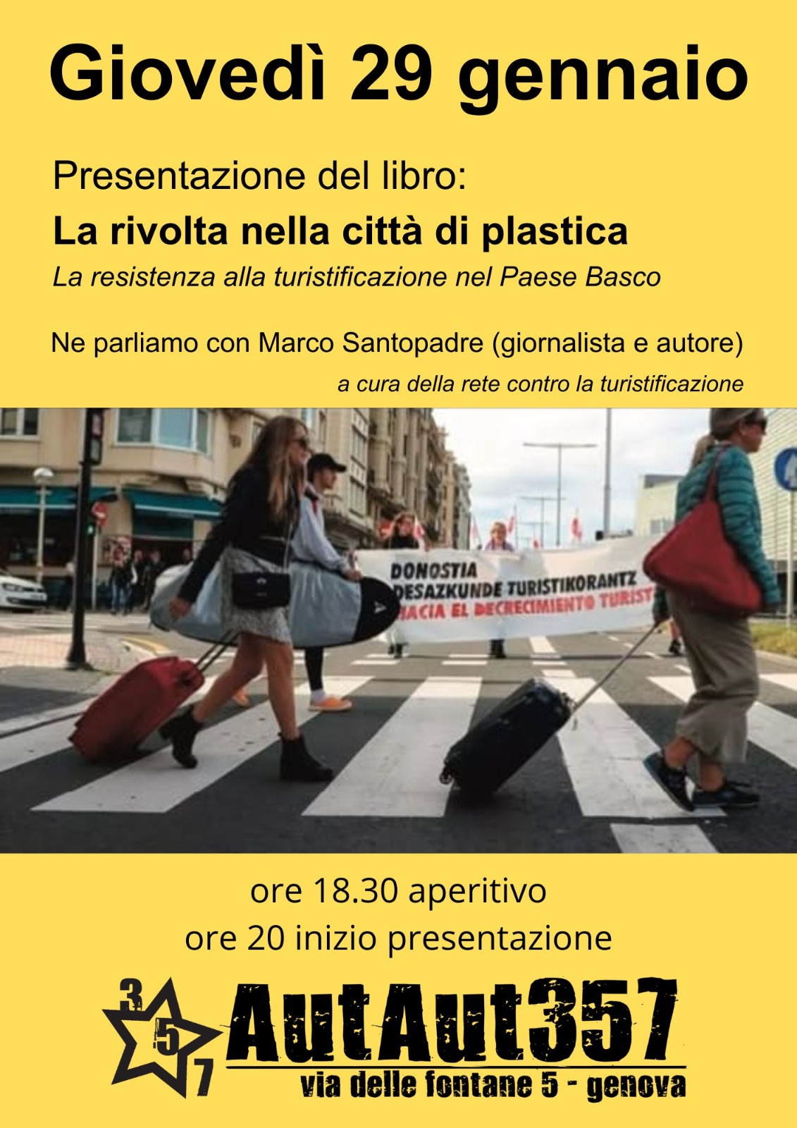 Giovedì 29 gennaio torniamo a parlare di turistificazione con l'autore del libro 'La rivolta nella città di plastica'. Marco Santopadre analizza approfonditamente il processo di turistificazione e gentrificazione degli ultimi decenni nel Paese Basco, in particolare soffermandosi sulla realtà di Donostia/San Sebastián, e ci racconta le forme di resistenza che si sono sviluppate. È un interessante strumento di riflessione per capire analogie e differenze con le dinamiche di trasformazione sociali, economiche e lavorative che questi fenomeni producono anche nella nostra città, fornendoci anche spunti per ragionare alle modalità con cui opporci alla "plastificazione" del nostro esistente.